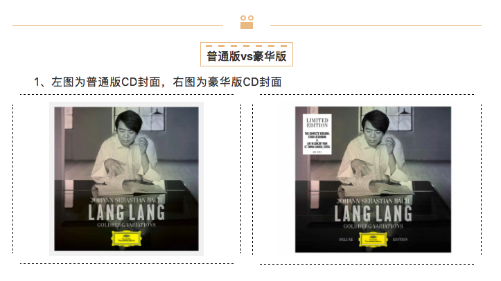 專輯 · 預(yù)訂 普通版:(2張CD錄于錄音棚) CD1——變奏曲1-15,共15變奏 CD2——變奏曲16-30,共15變奏+結(jié)尾變奏曲 市場指導價:¥75 豪華版:(2張CD錄于錄音棚,2CD為現(xiàn)場萊比錫實況錄音) CD1——變奏曲1-15,共15變奏 CD2——變奏曲16-30,共15變奏+結(jié)尾變奏曲 市場指導價:¥150 預(yù)定方式:聯(lián)系三毛琴行任一門店預(yù)定(各門店聯(lián)系方式請下拉至文末查看) 預(yù)定時間:即刻起可聯(lián)系三毛琴行門店預(yù)定,第一批預(yù)定時間于明天上午(9月3日)10點截止。 2、豪華版CD比普通版多兩張萊比錫音樂會專場實錄。整場音樂會一氣呵成,音樂會專場CD實錄無法修音,最能體現(xiàn)鋼琴家的實力,小編已經(jīng)準備好搶訂豪華版CD啦!