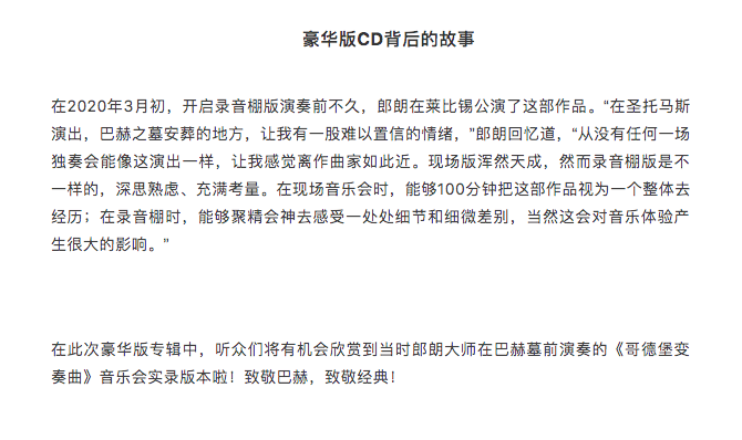 錯過了現(xiàn)場演出的朋友也別著急,郎朗《哥德堡變奏曲》實體專輯也即將在9月4日全球首發(fā)。三毛琴行可搶先預(yù)定,往下看可了解具體預(yù)定方式。