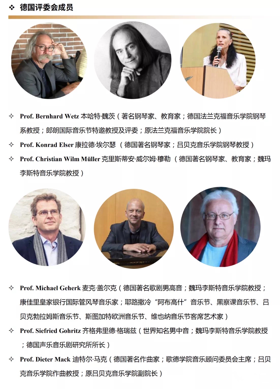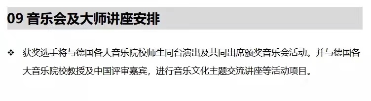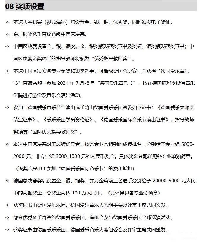 本次中國區(qū)決賽各專業(yè)金獎和銀獎選手,可晉級德國總決賽,并獲得“德國愛樂音樂節(jié)”直通名額,參加2021年7月-8月“德國愛樂音樂節(jié)”,將在德國魏瑪李斯特音樂學院進行的游學及音樂會演出活動。