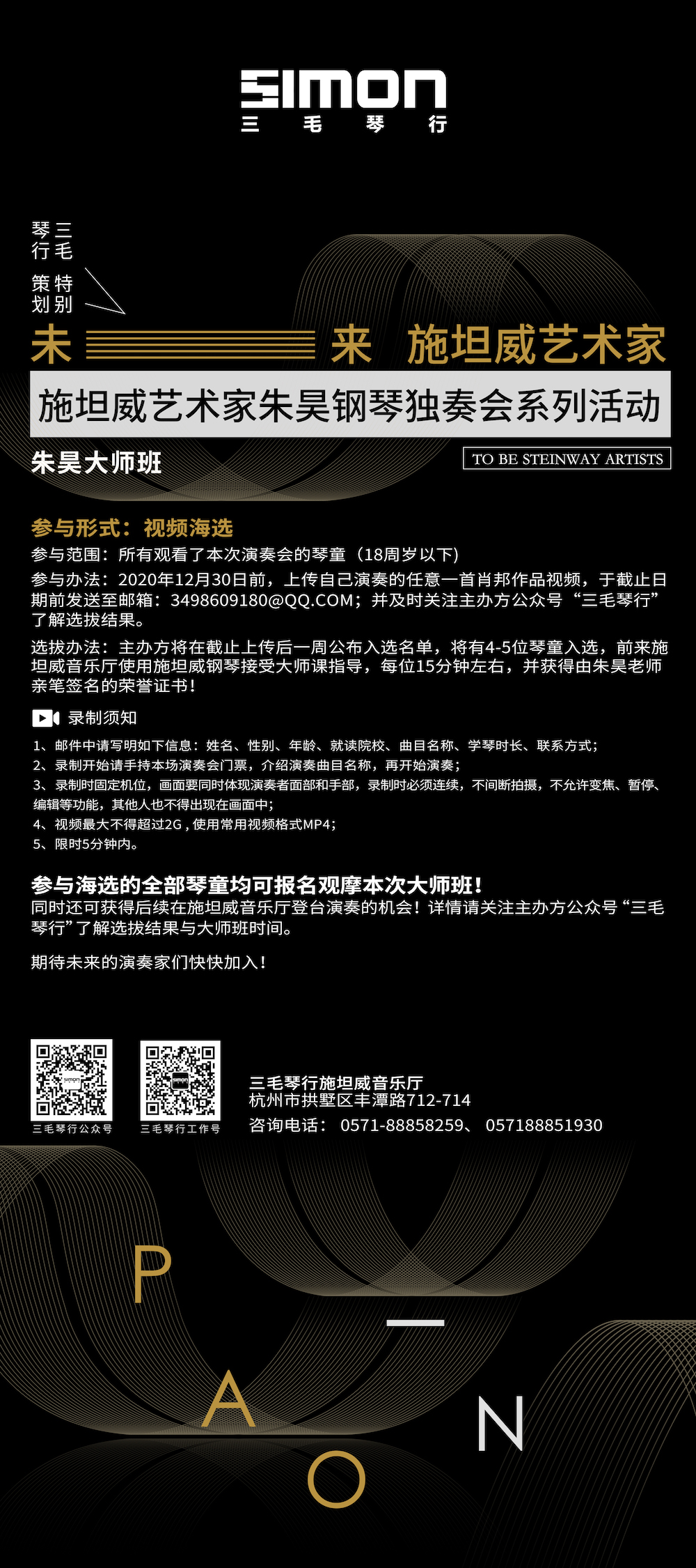 此次音樂會(huì)使用的是施坦威的D247三角鋼琴,這架典雅尊貴的三角鋼琴堪稱世界頂級鋼琴家與機(jī)構(gòu)的不二選擇,也適合寬敞的私人居所,其音質(zhì)足以完全滿足那些追求高音樂表現(xiàn)力的演奏者們和音樂愛好者們。4、三毛琴行特別策劃——朱昊大師班
