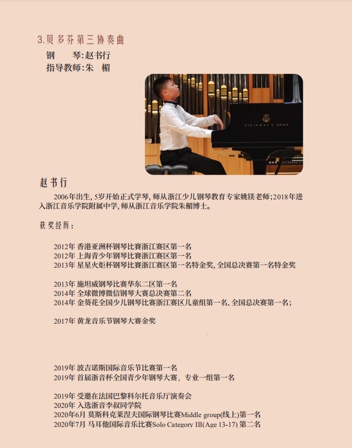 2020年12月24日晚19點30分,紀(jì)念貝多芬誕辰250周年暨浙江音樂學(xué)院鋼琴系“貝多芬鋼琴協(xié)奏曲”比賽決賽將在浙江音樂學(xué)院周穎音樂廳隆重舉行。作為此次比賽的獨家支持單位,三毛琴行預(yù)祝各位選手,再創(chuàng)佳績!讓我們一起期待施坦威鋼琴的無與倫比的音樂表現(xiàn)力與各位參賽者出色的演奏水平相互配合,為聽眾帶來一場精彩絕倫的視聽享受。