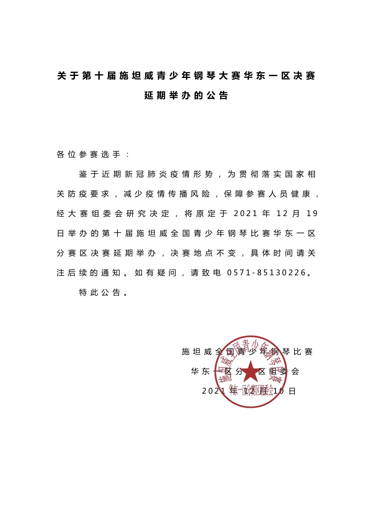 鑒于近期的新冠疫情形勢,為貫徹落實國家相關(guān)防疫要求,減少疫情傳播風(fēng)險,保障參賽選手及工作人員的身體健康和生命安全,經(jīng)大賽組委會研究決定:原定于2021年12月19日舉辦的第十屆施坦威青少年鋼琴大賽華東一區(qū)分賽區(qū)決賽延期舉辦,決賽地點不變,具體時間請關(guān)注后續(xù)的通知。如有疑問,請致電0571-85130226。